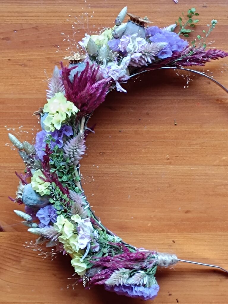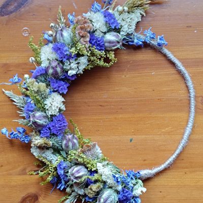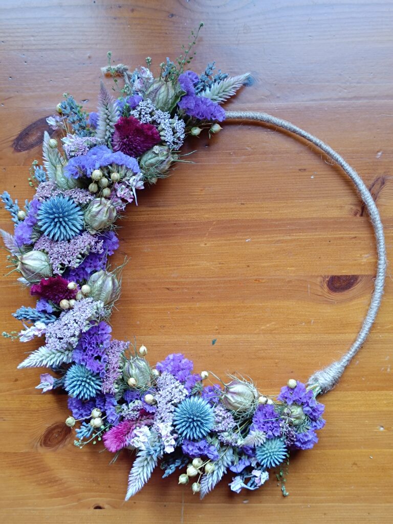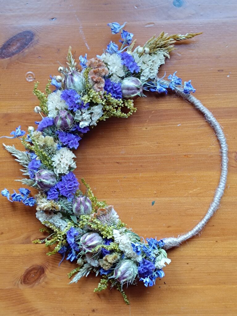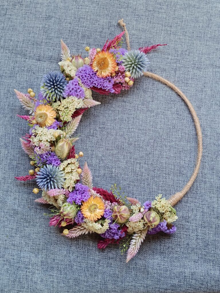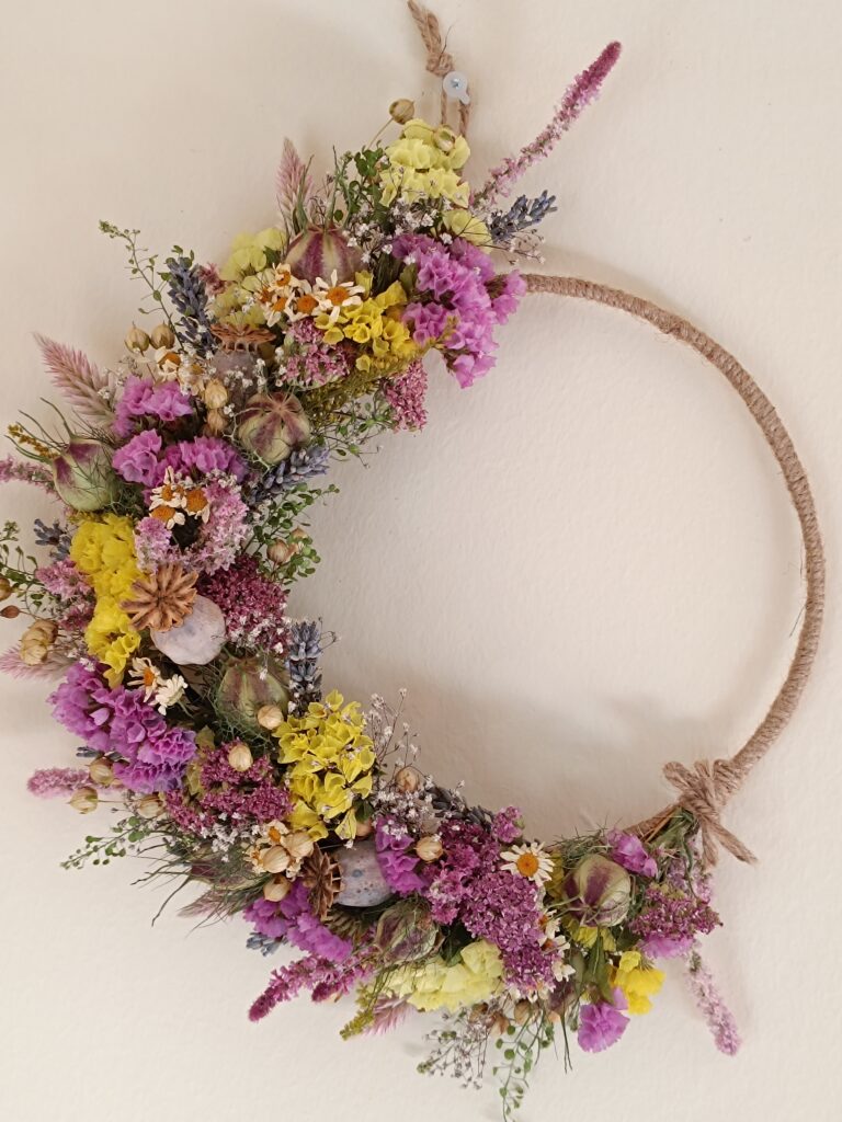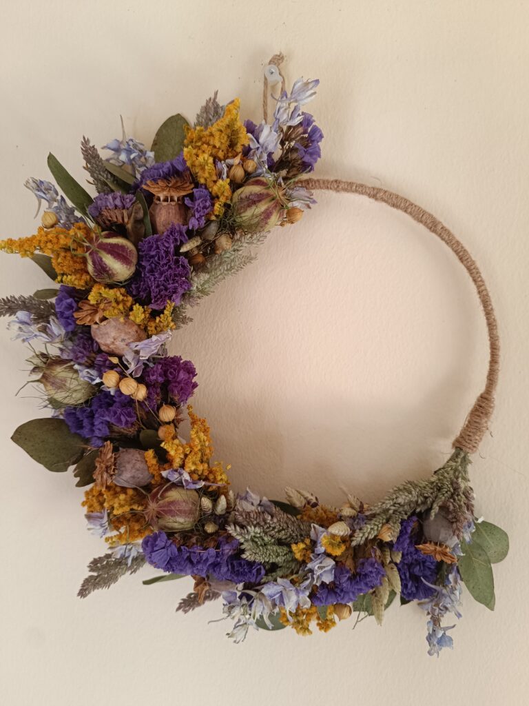 Coronas elaboradas a mano con flores secas cultivadas de forma artesanal. Disponibles en distintos tamaños, perfectas para decorar tu hogar, regalar o dar un toque natural y único a tus celebraciones